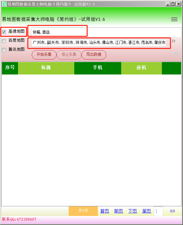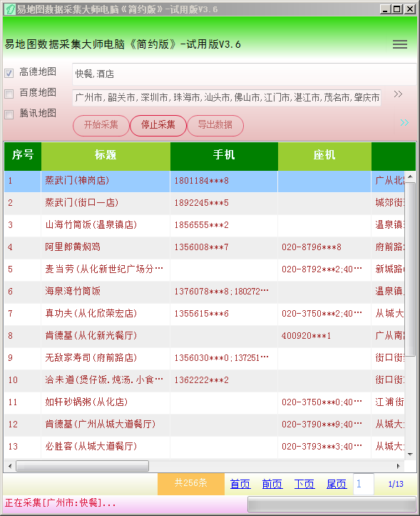 在主界面上选择采集的地图(可以选择多个一起采集),我们选择“高德地图”,输入搜索“关键词“快餐,酒店”,再选择采集的城市(如我们广东的城市),再点“开始采集”即可采集,如下图: