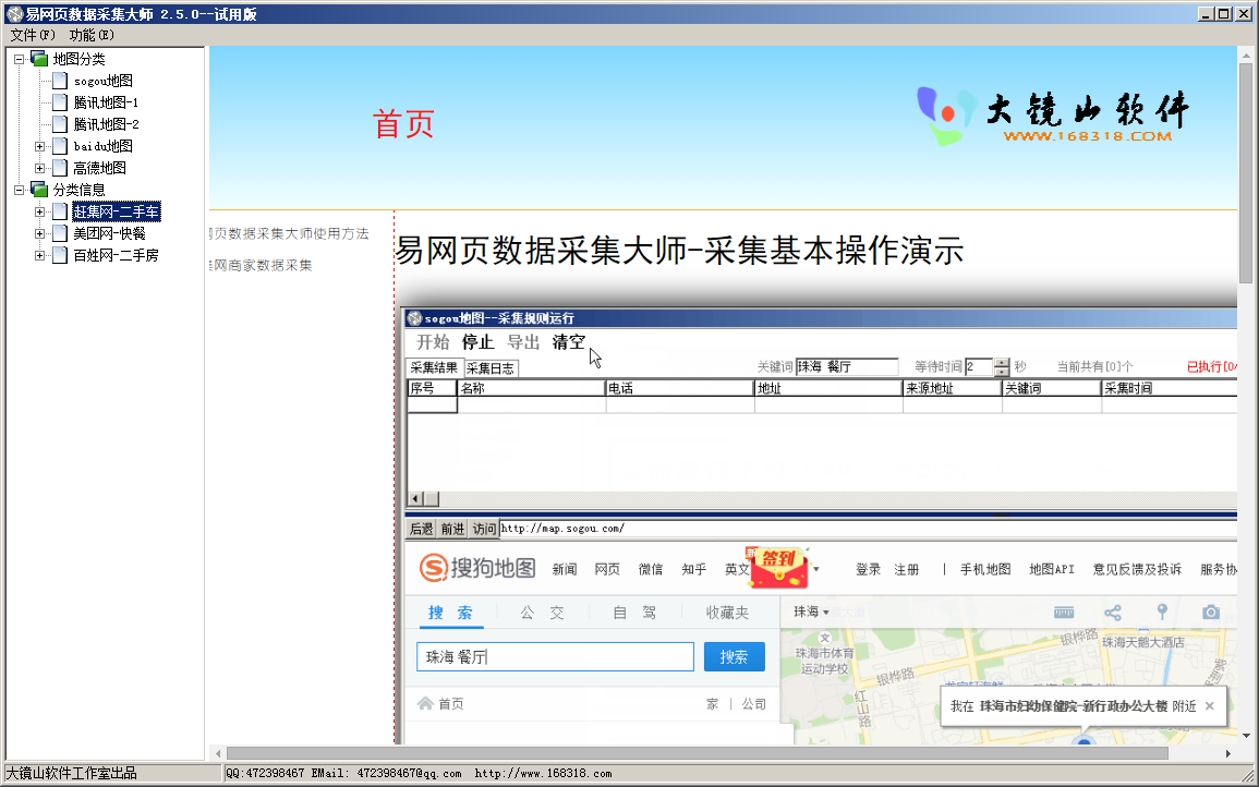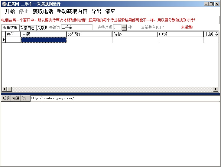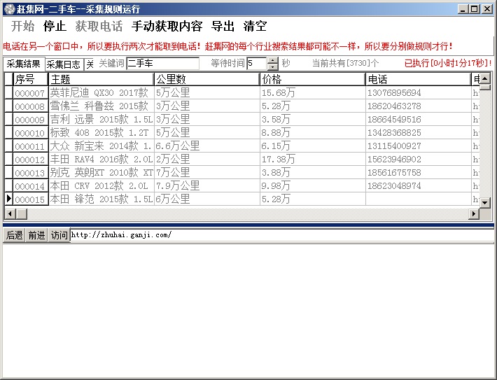 说明:赶集(http://ganji.com)网特点的是每一大类搜索结果都不同,因此要对每一分类搜索做数据采集规则,在这时我们以搜索关键词“二手车”为例说明如何采集其商家数据。赶集网商家电话号码采集方法: