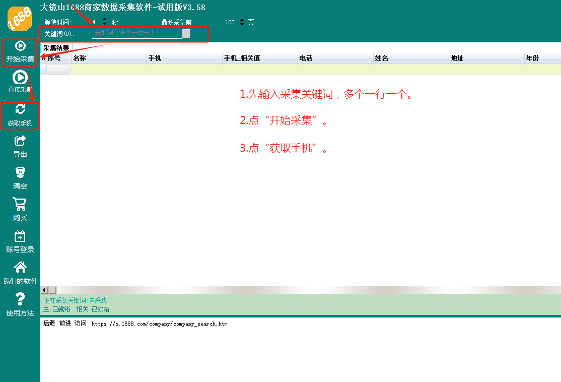 打开如下图的窗口,输入采集的关键词,再点“开始采集”和“获取手机”即可。