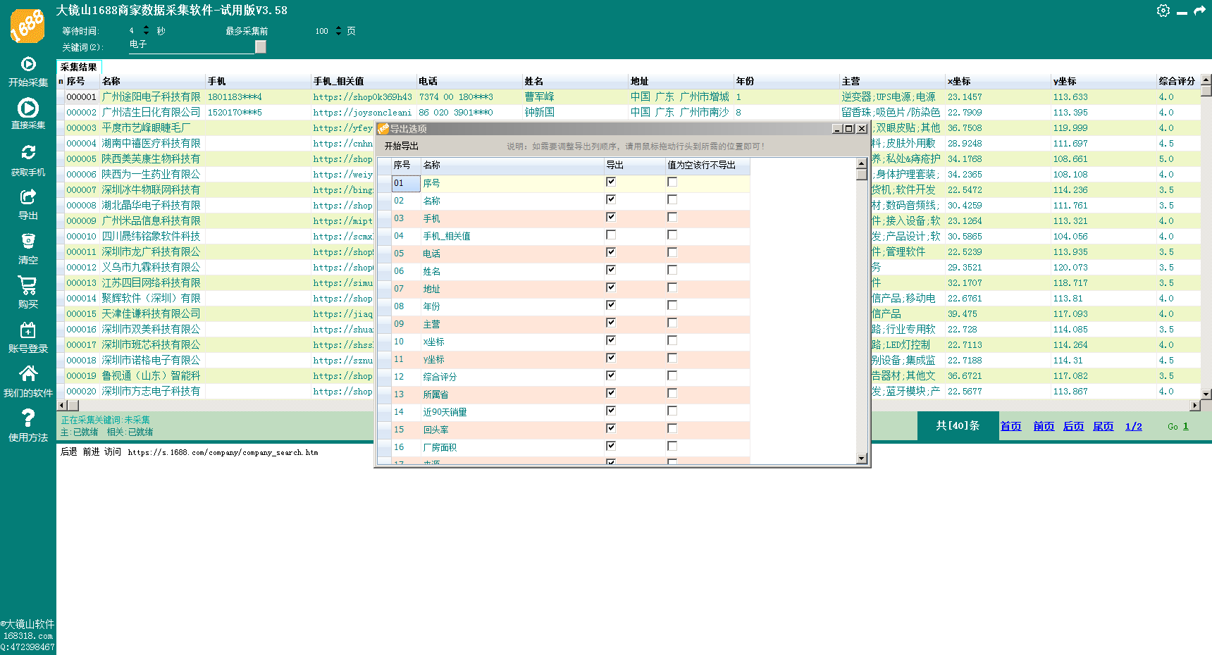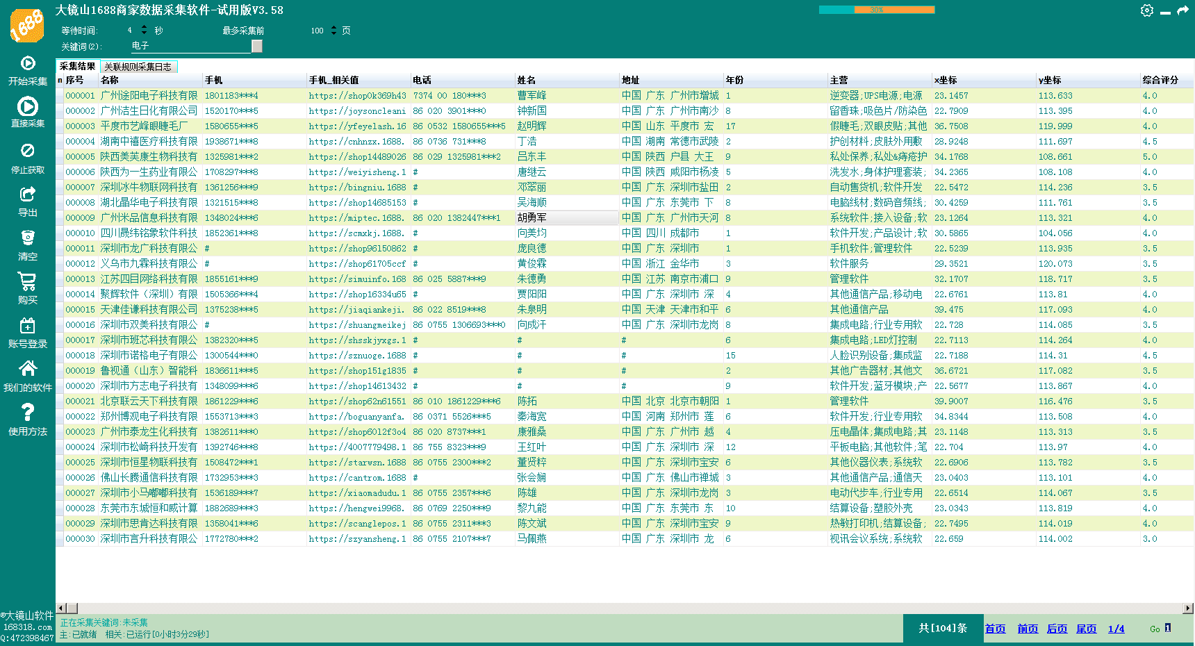 — 大镜山阿里1688商家数据采集一款采集阿里巴巴1688.com商家数据的软件,采集的数据包括店铺名称、联系人姓名、手机号码等。