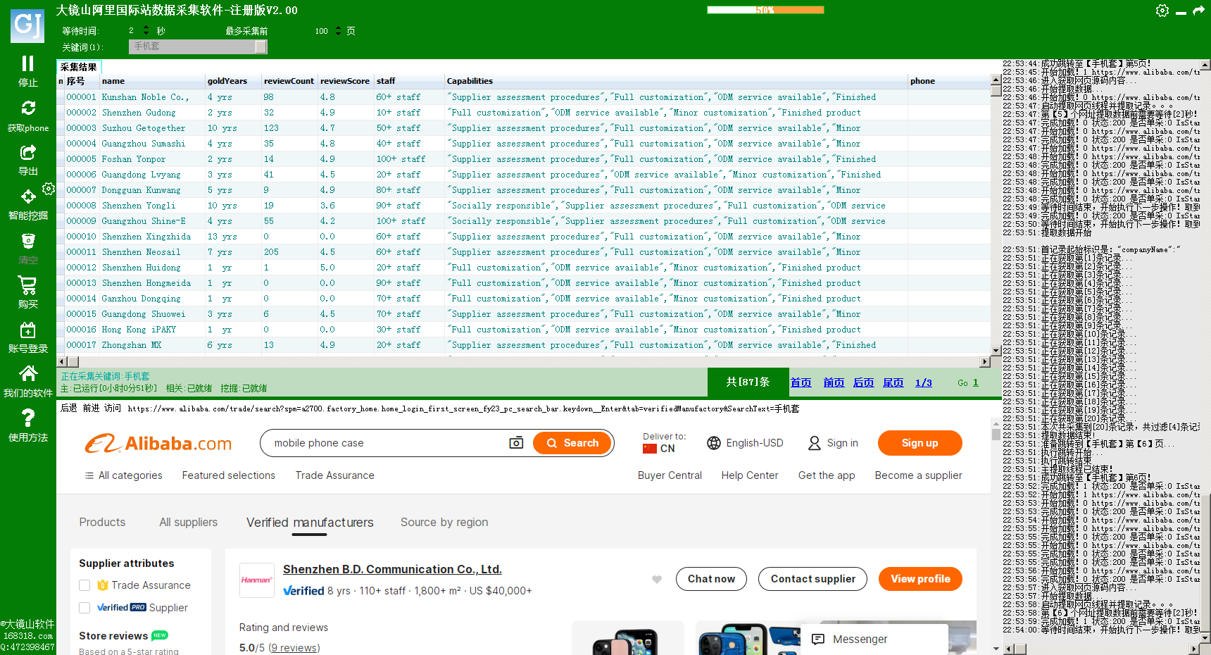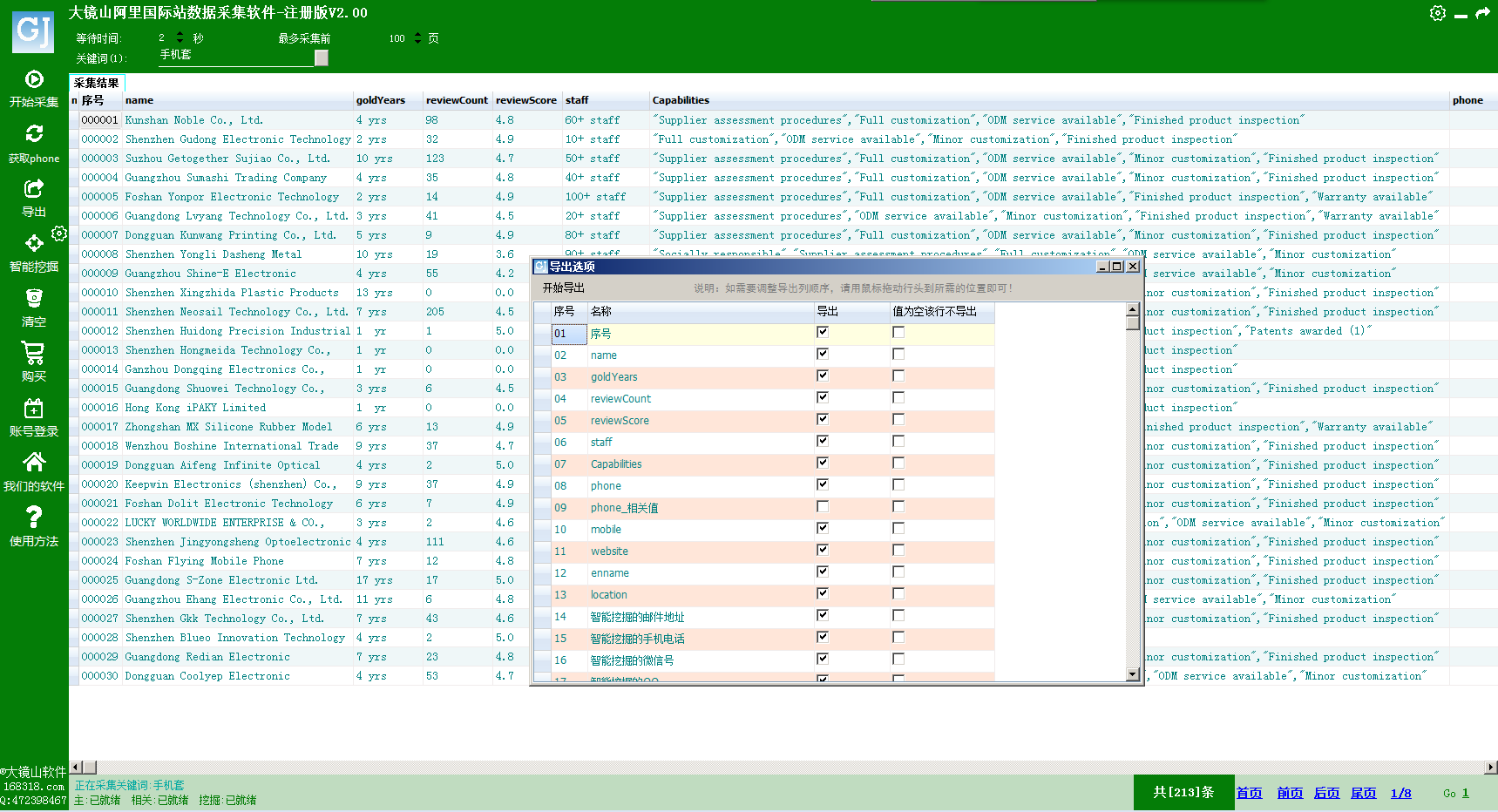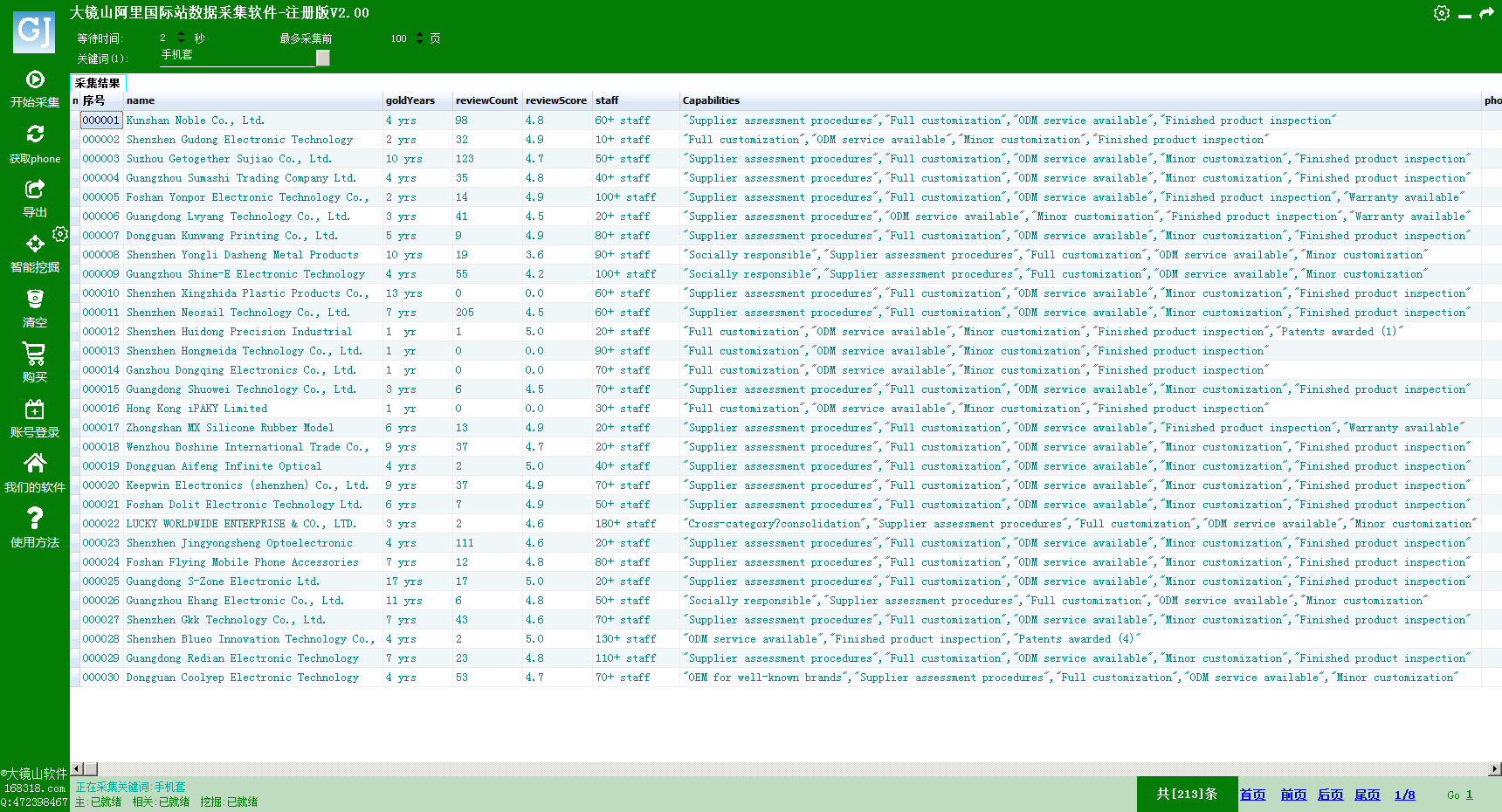 大镜山阿里巴巴国际站数据采集软件一款采集阿里巴巴国际站alibaba.com商家数据的软件,采集的数据包括店铺名称、店铺年份、评分、邮件地址、手机号码、网址及社交连接等。